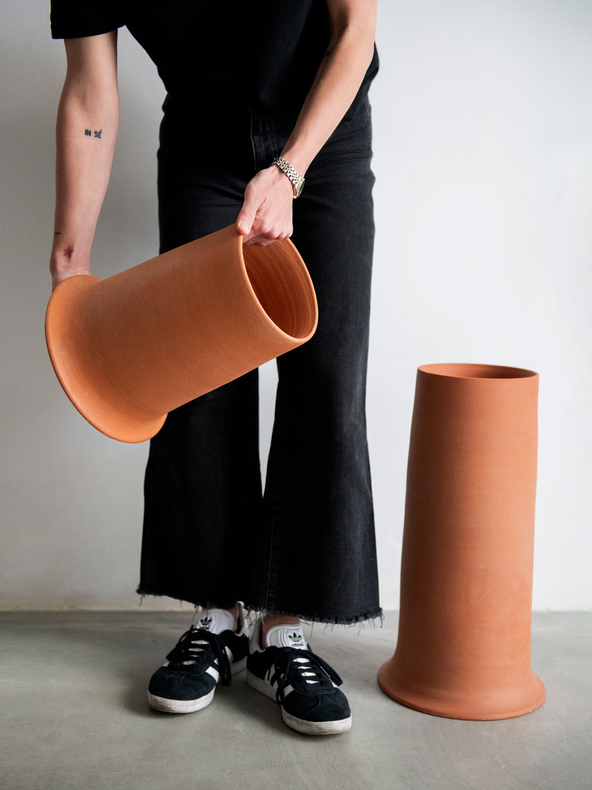 The collection borrows the form, material and dimensions of Parisian chimneys, shifting them from rooftop to interior. Removed from context, they become containers for domestic or outdoor use, echoing the skyline they come from.