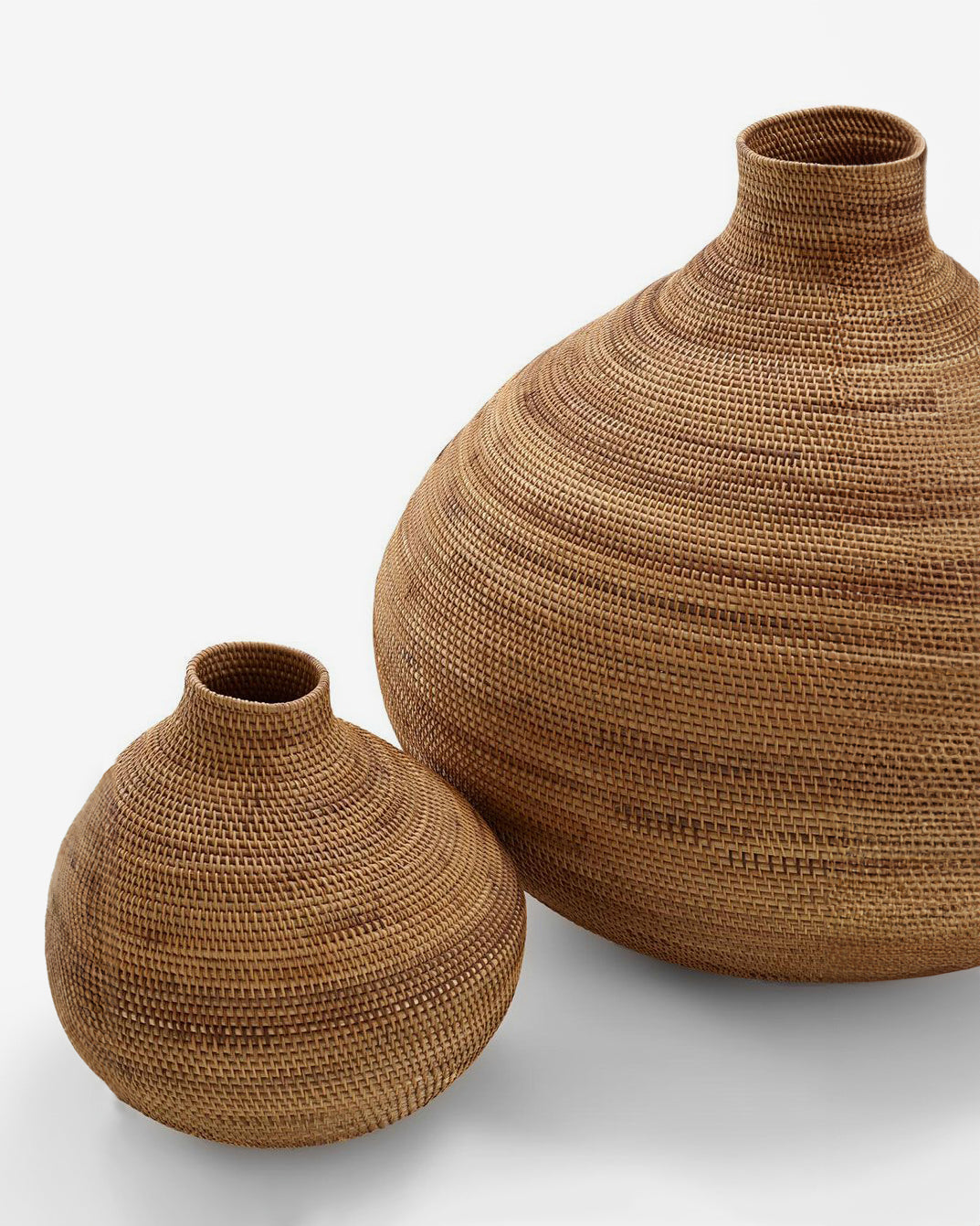 Large rattan jars handwoven in heart cane. Each piece varies in form and tension, shaped freely by the maker. The scale moves the object toward sculpture. Inspired by African basketry, the project links material, gesture, and manual construction.