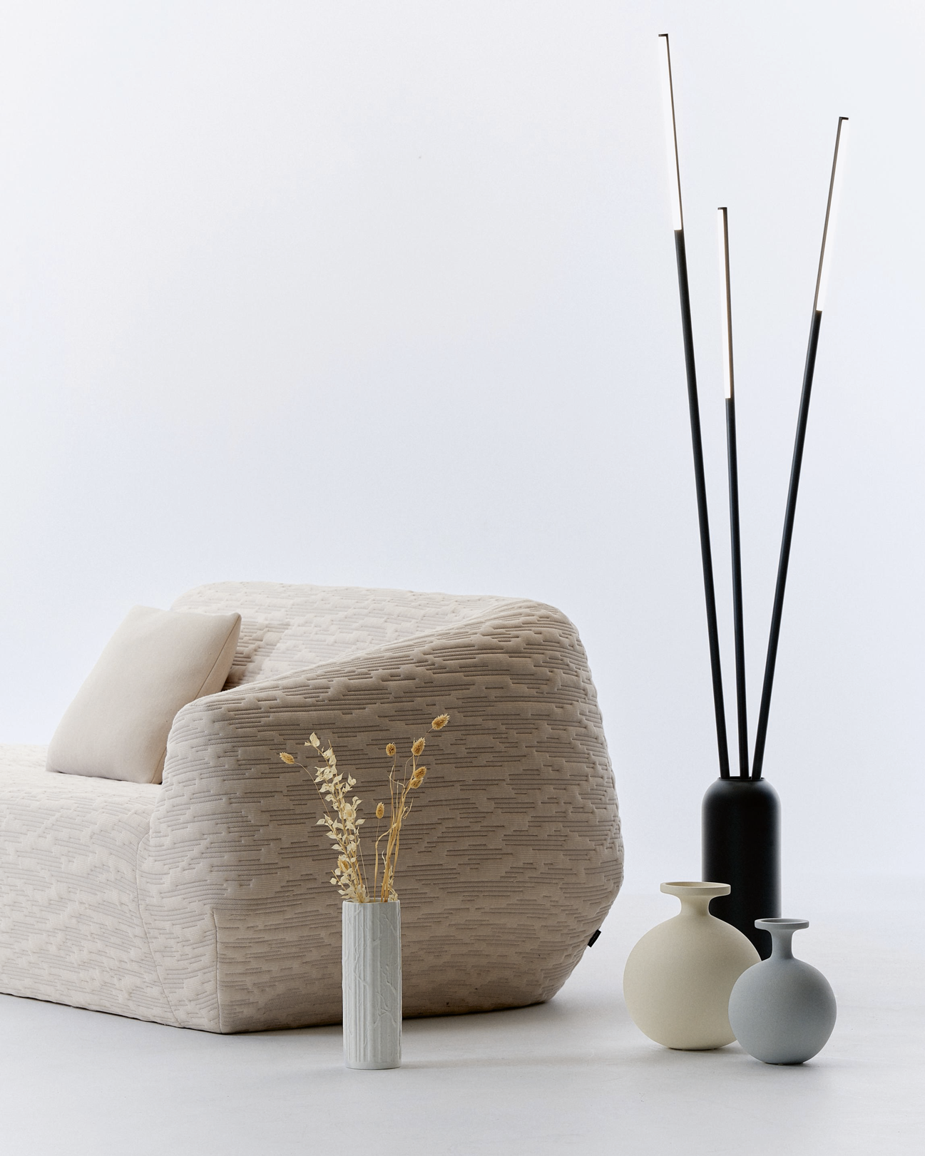 A lighting device built around rotating stems. Each arm tilts and turns up to 330°, allowing the direction and intensity of light to be adjusted. Movement is not an effect, it’s the structure. The lamp responds to space through continuous repositioning. A foot-operated dimmer controls the light from soft ambient to sharp beam. The user sets the rhythm.
